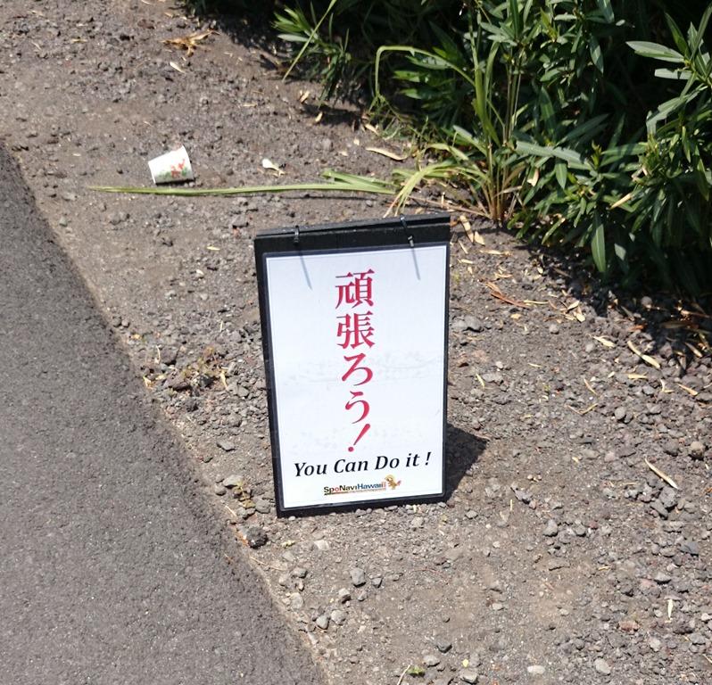 なんとか市街地まで戻るも、少し走ると歩くというモードになってしまいました。途中、看板にも頑張ろうと応援してもらう始末(笑)