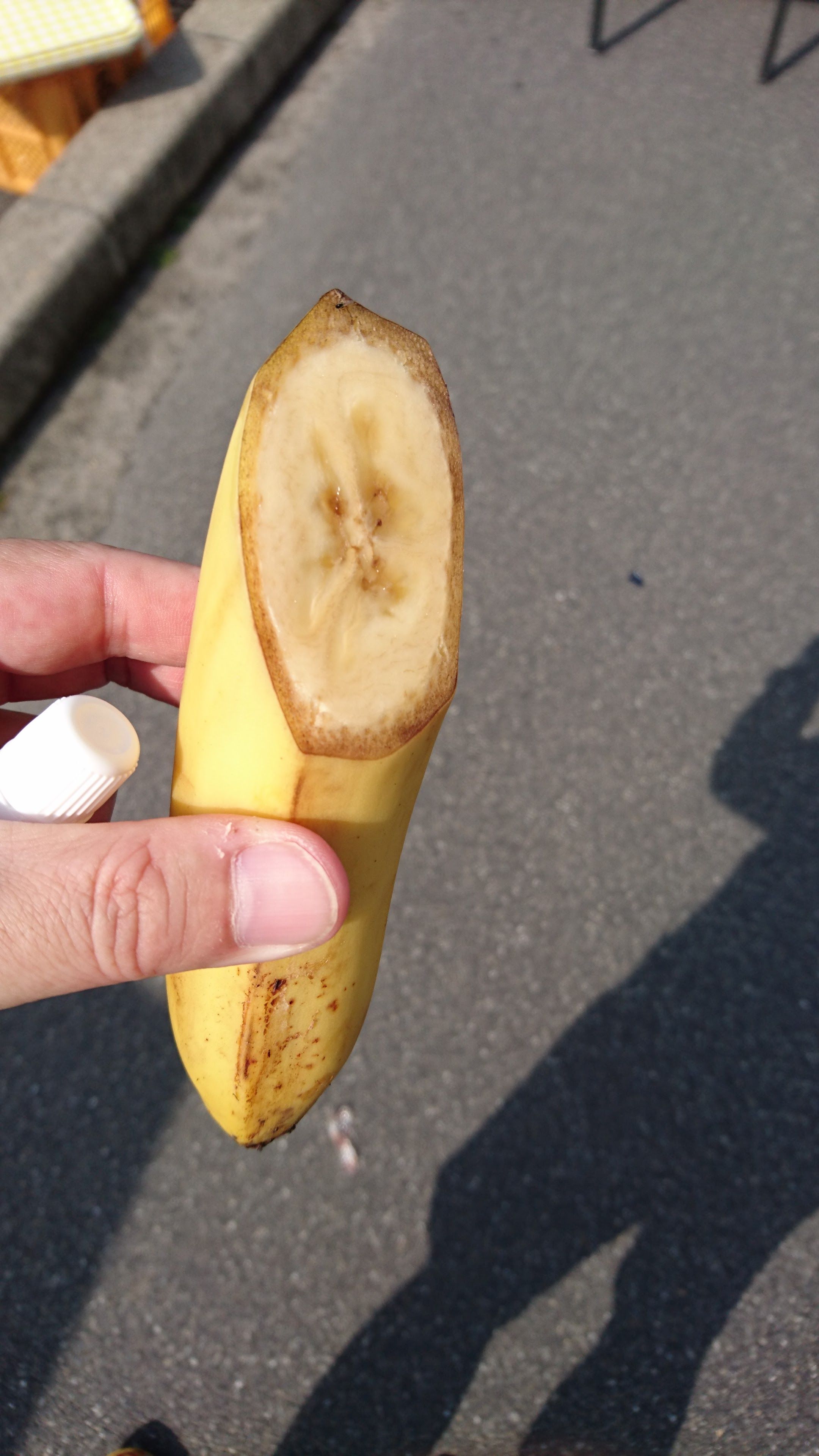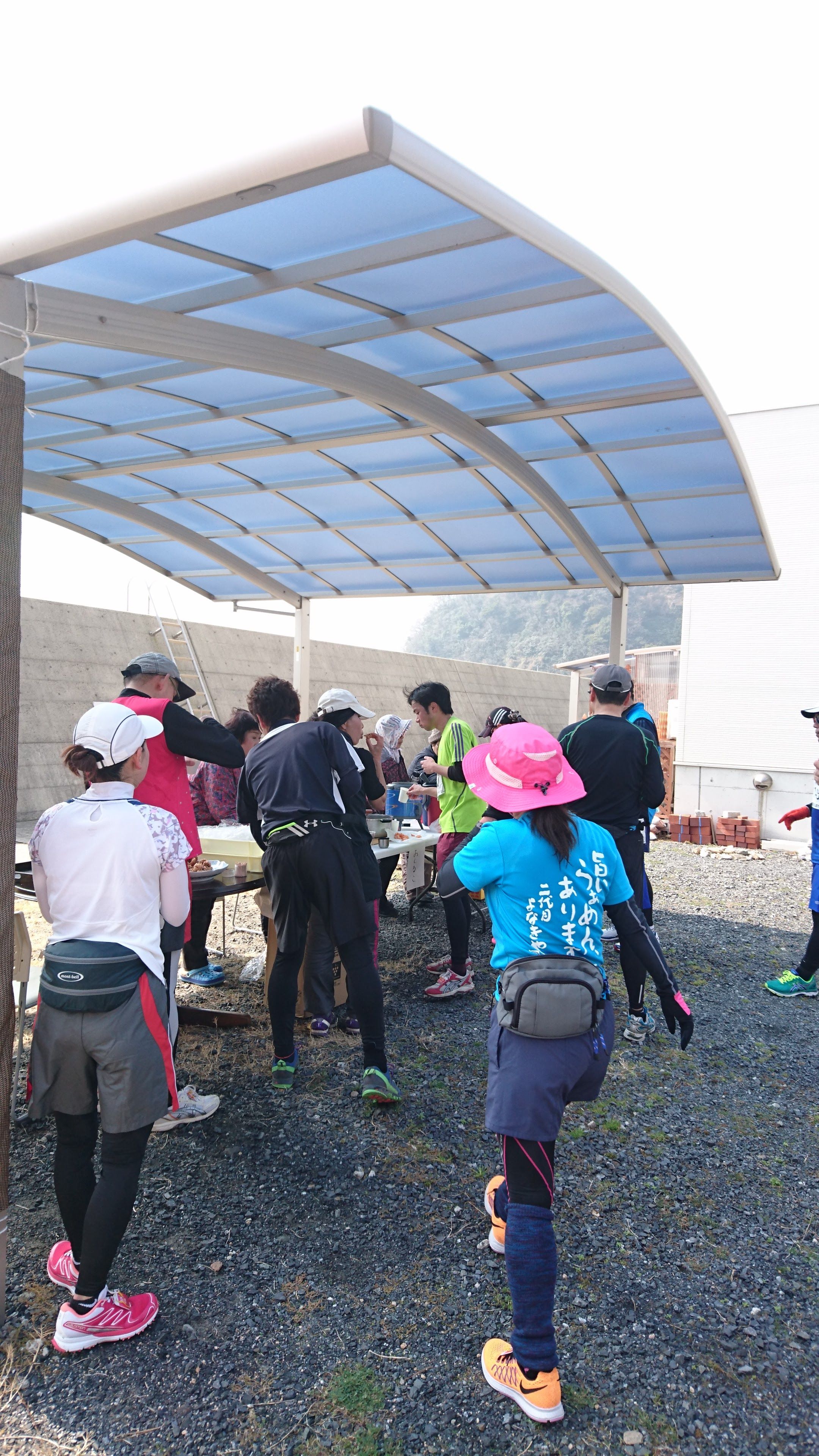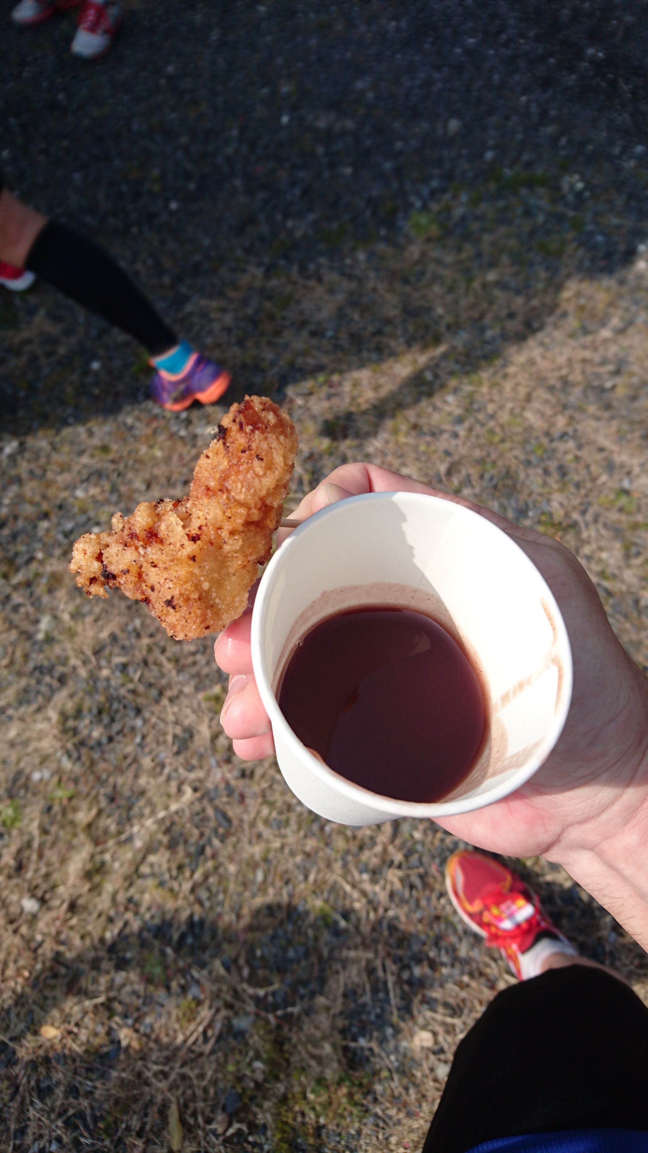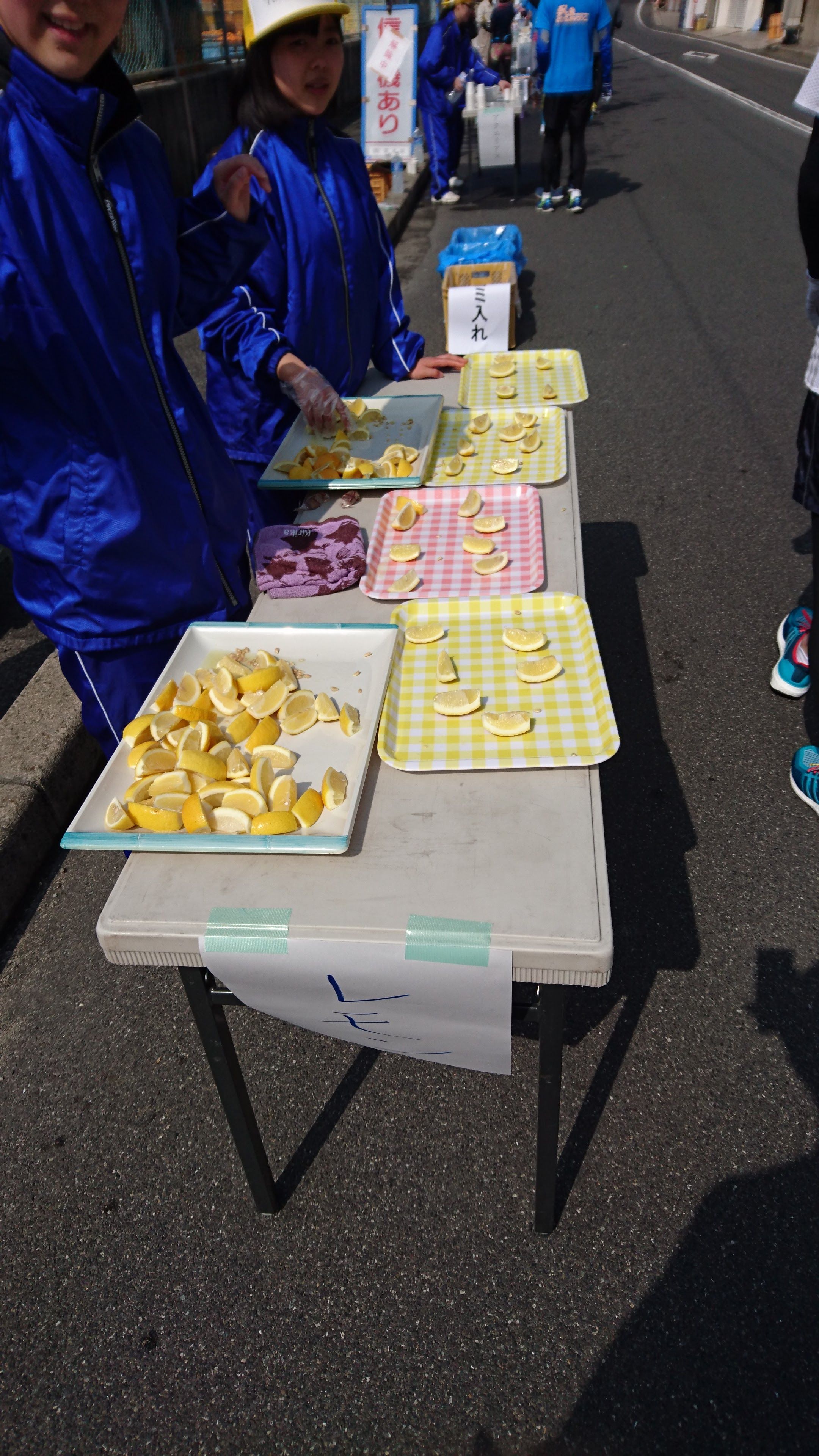 レースで気になるのは給食!18km ぐらいのところでは駐車場で軽食を振舞っている家があり、お汁粉をいただいちゃいました。これ以外にも公式エイドでは、バナナ、クリームパン、レモンなどなど数多くのサポートが提供されています。レモンは酸っぱかった(笑