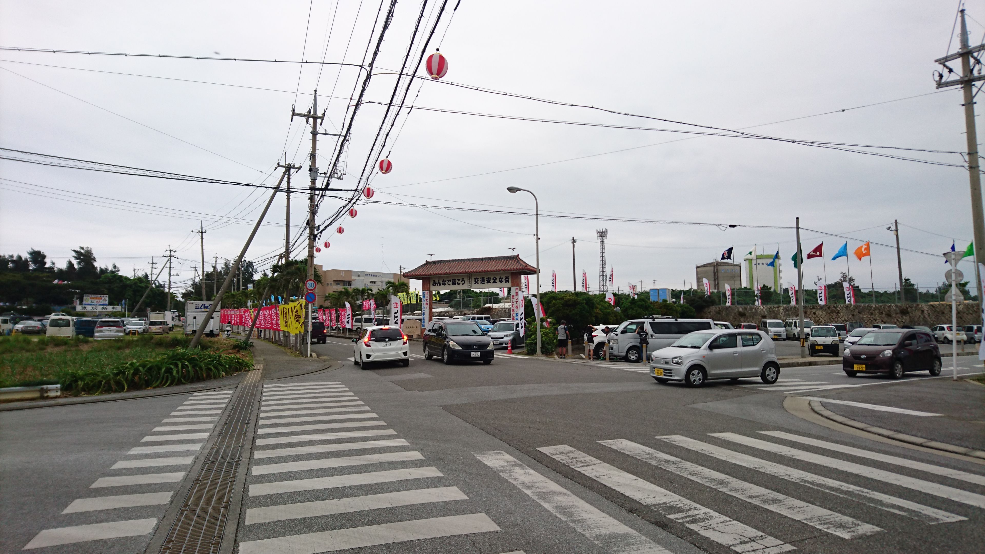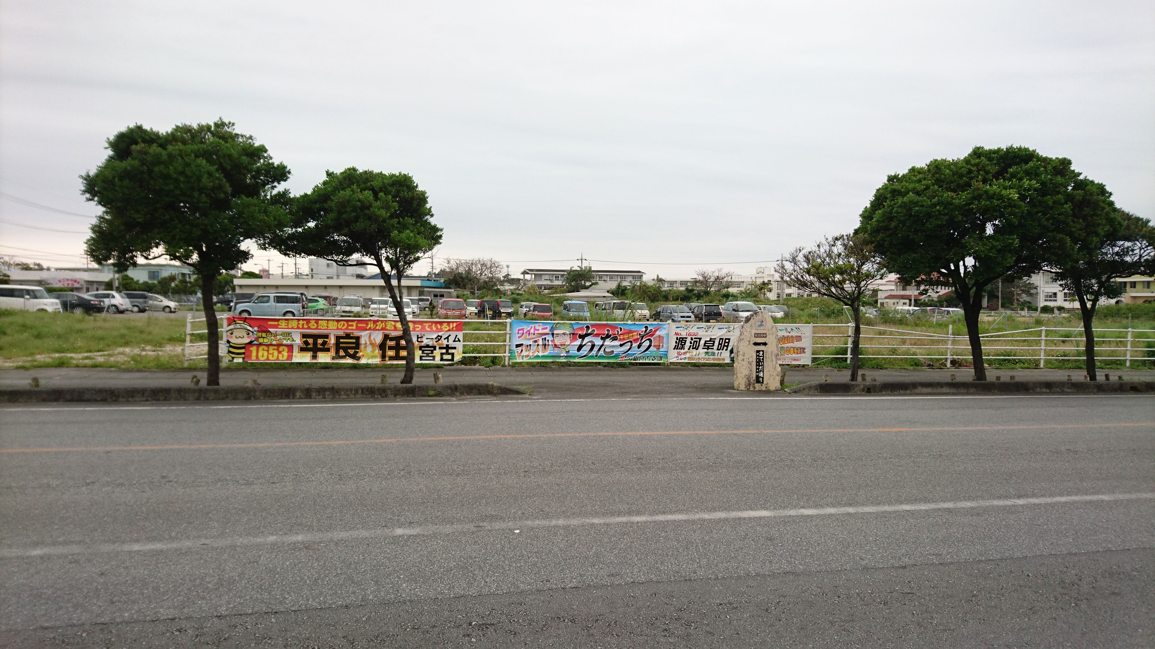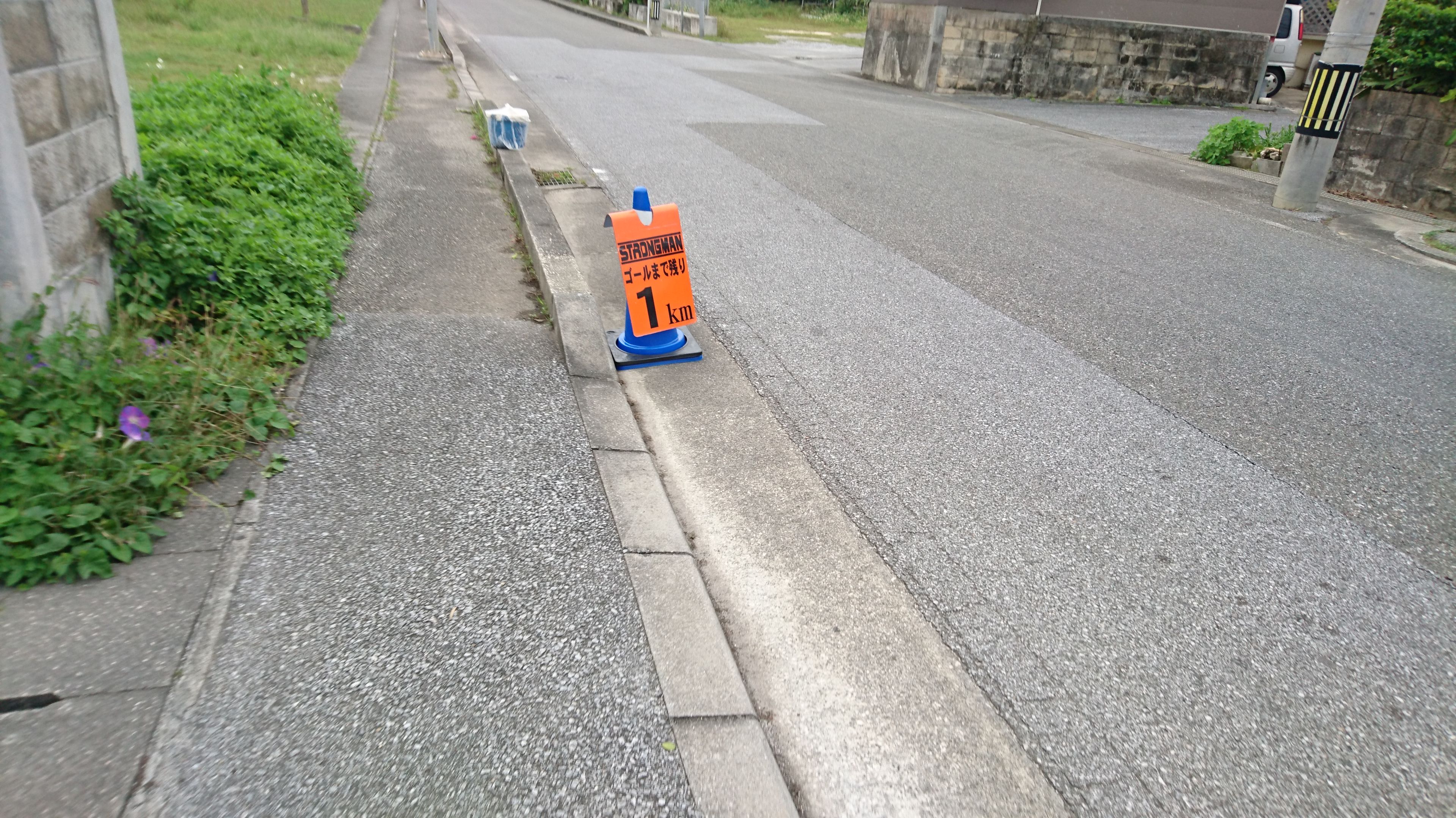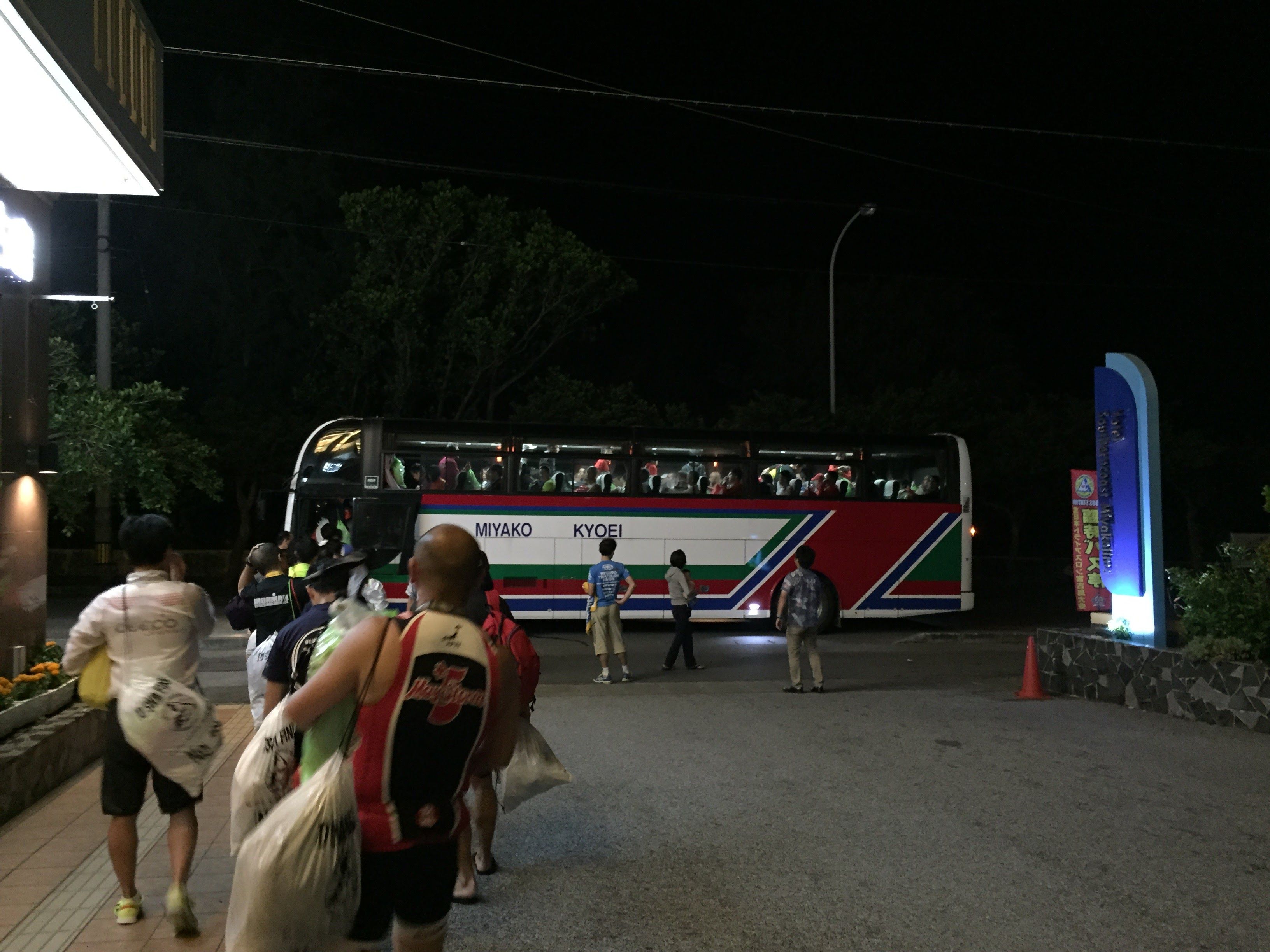 最初の関門となるハーフの折り返し地点、宮古島の交通安全を守る「まもるくん」がいます。ここを折り返す時に、制限時間をみると 45 分ほどあります。あれ?と思ってスタッフの人に確認をすると「ゴールのタイムリミットは 20:30 なので、今からゆっくりでも走り切ればゴールできますよ」と言われます。マジですか!もう無理と思っていたのですが、突然 30 分ものボーナスをいただいた気分です(間違えていた私が悪いのですが)。