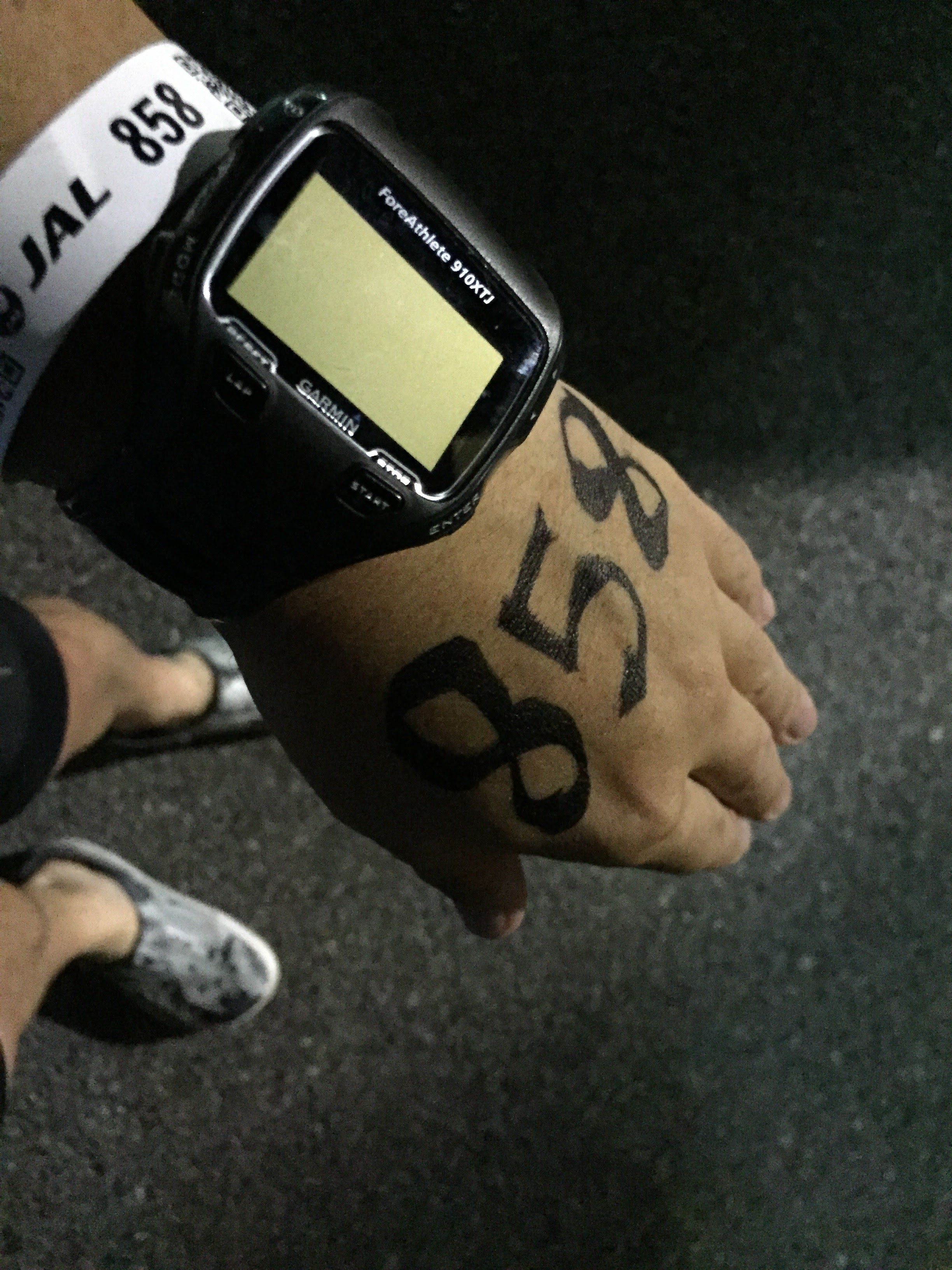 続いてマーキングです。トライアスロンでは必ず腕、手の甲などに番号を記載する形になっており、マーキングをして続いてスイムフィニッッシュの荷物置き場に移動をします。