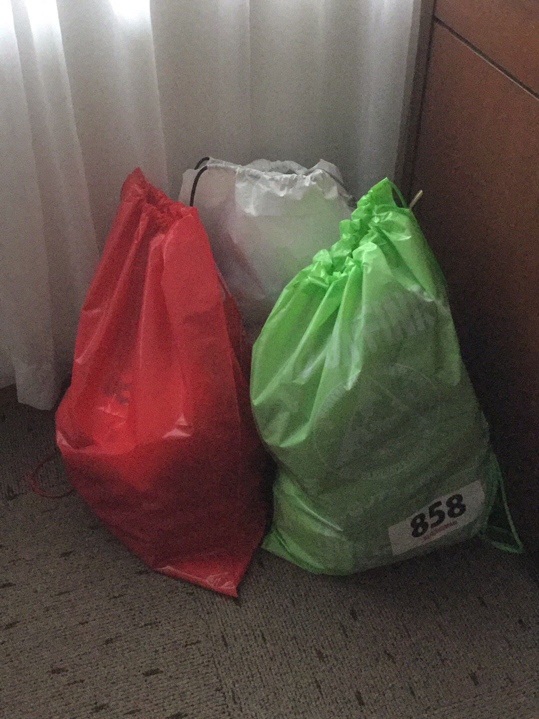 アスリートの朝は早いです。宿泊したホテルはゴールの近所だったのですが、スタート地点まではバスで移動をする必要があります。このため、3:00 から朝食(なので 2:30 には起きます)、4:40 のバスでスタート地点に移動をします。その際、スイム終了時のバッグ、バイク終了時のバッグ、ゴールした後のバッグと荷物をまとめておきます。