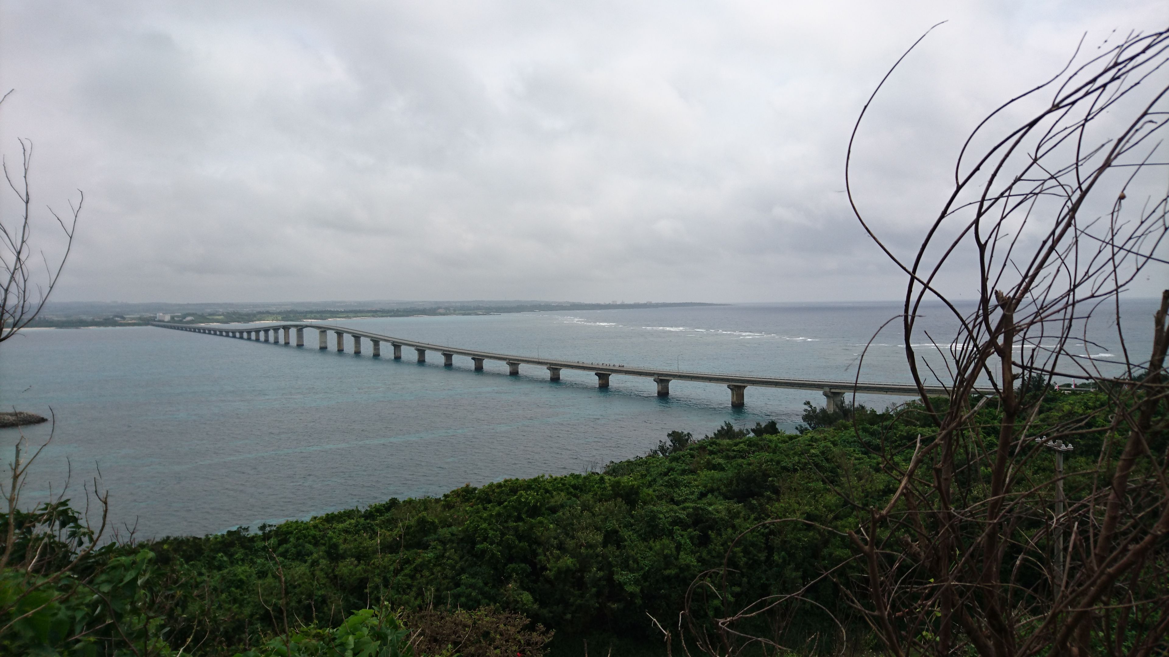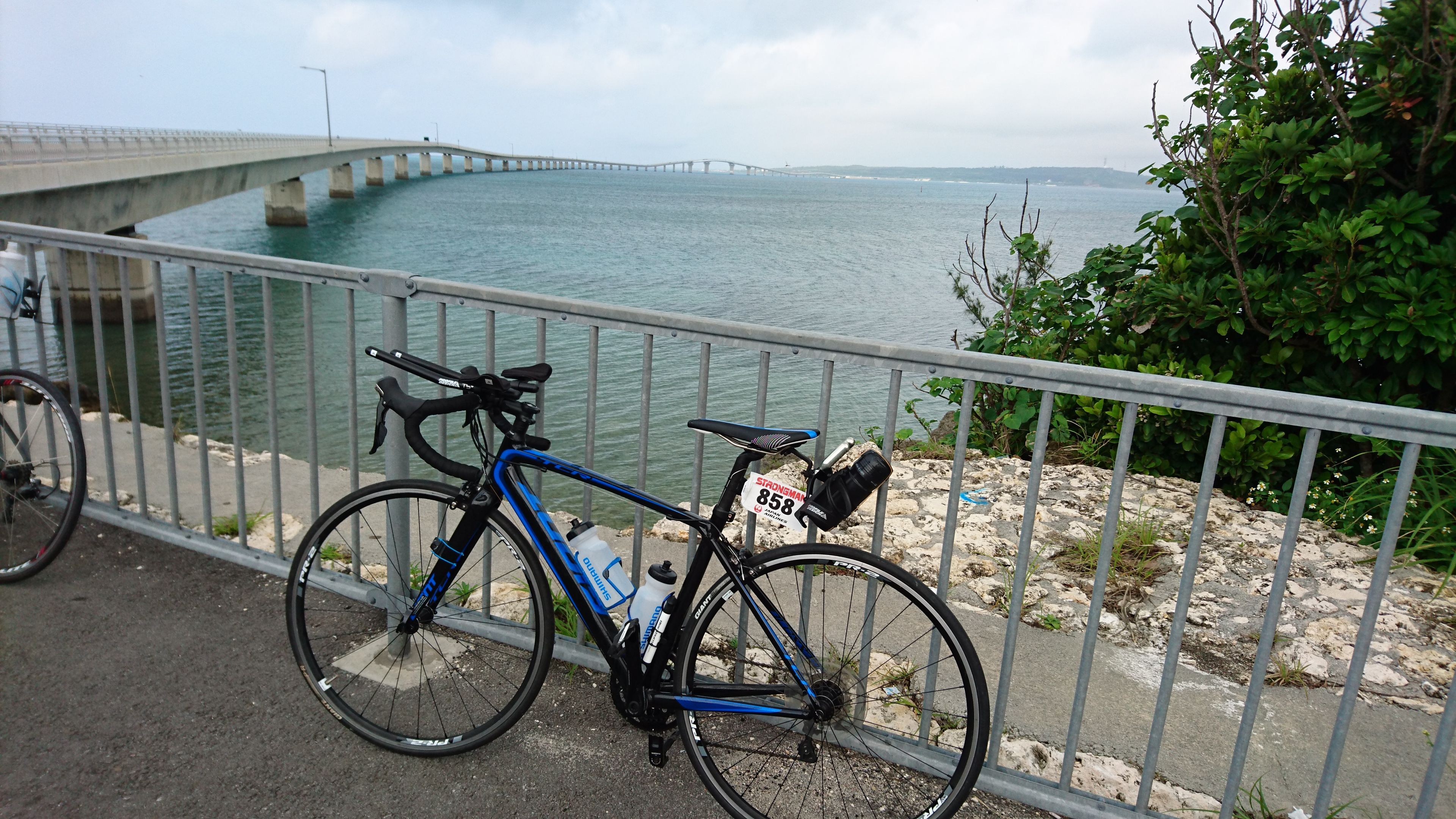 まずは伊良部大橋、この橋は無料で渡れる橋としては最長だそうです。レースの前日に撮った写真ですが、3700m ぐらいあります。そして向こうの島も自転車で走ります。
