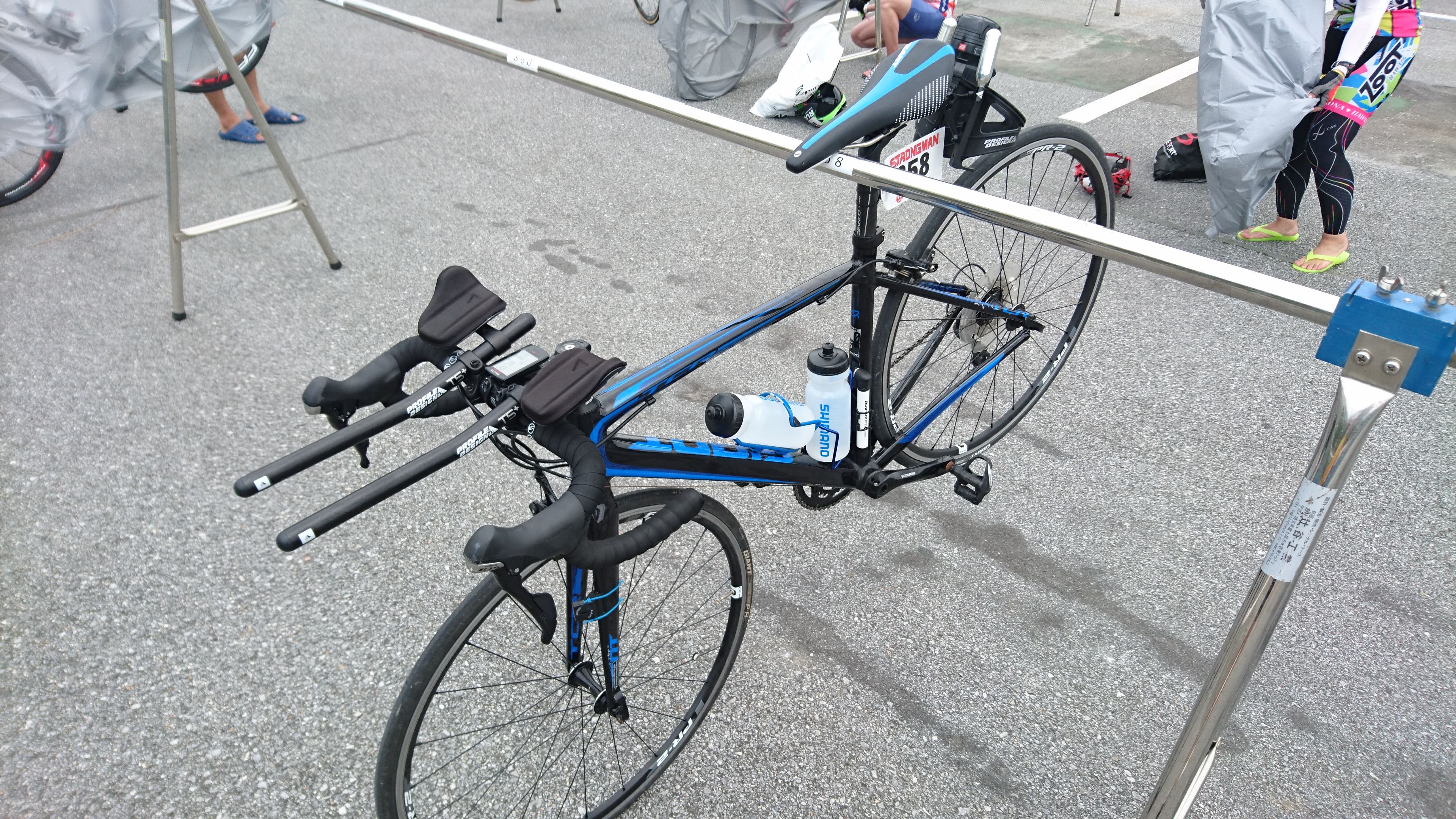 スイムアップをしたあとに利用するバッグから自転車のグッズを一通りおいて、ウェットを着て、いざ入水チェック、レース開始まで少しウォーミングアップをして準備をする形になります。