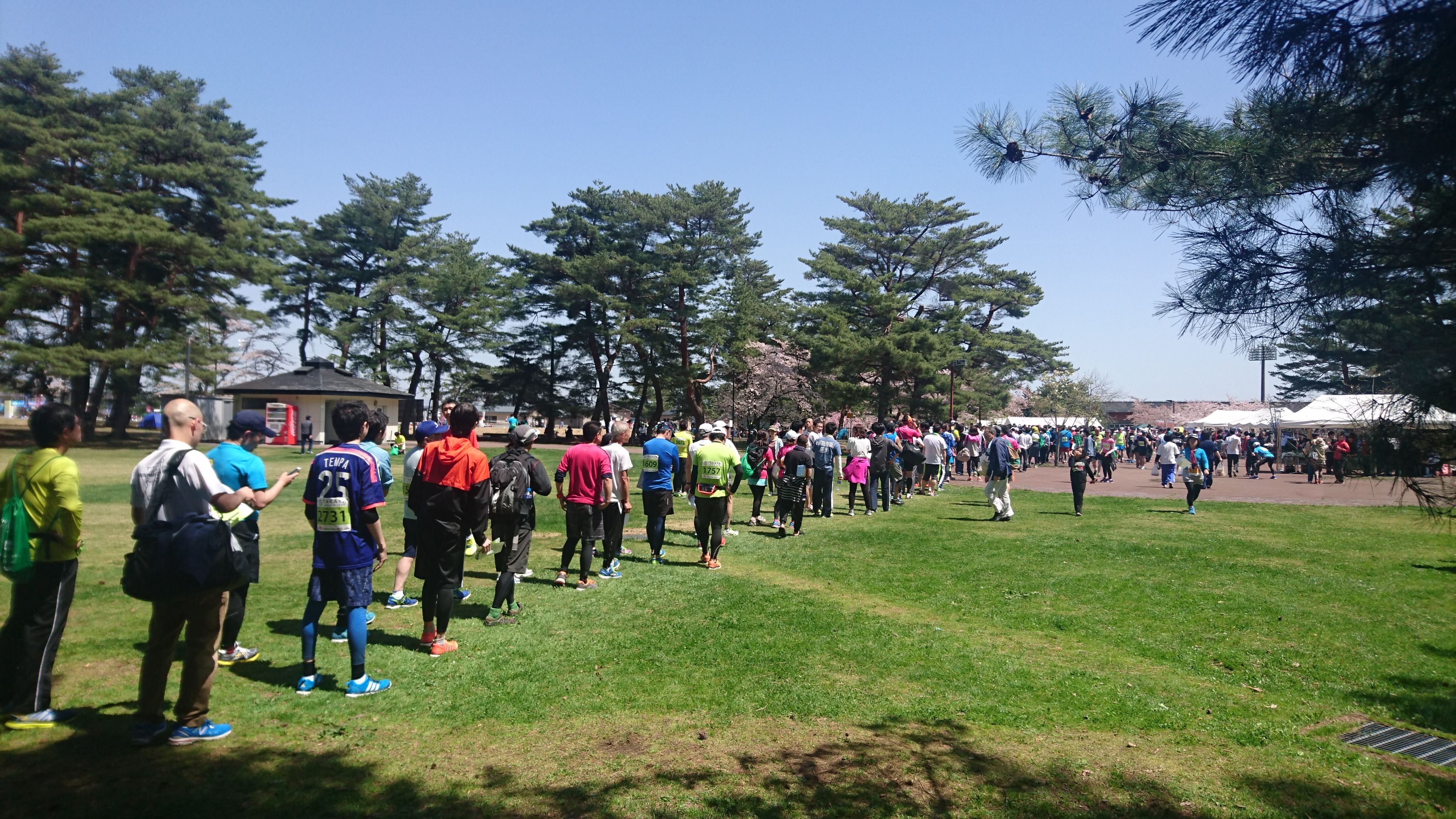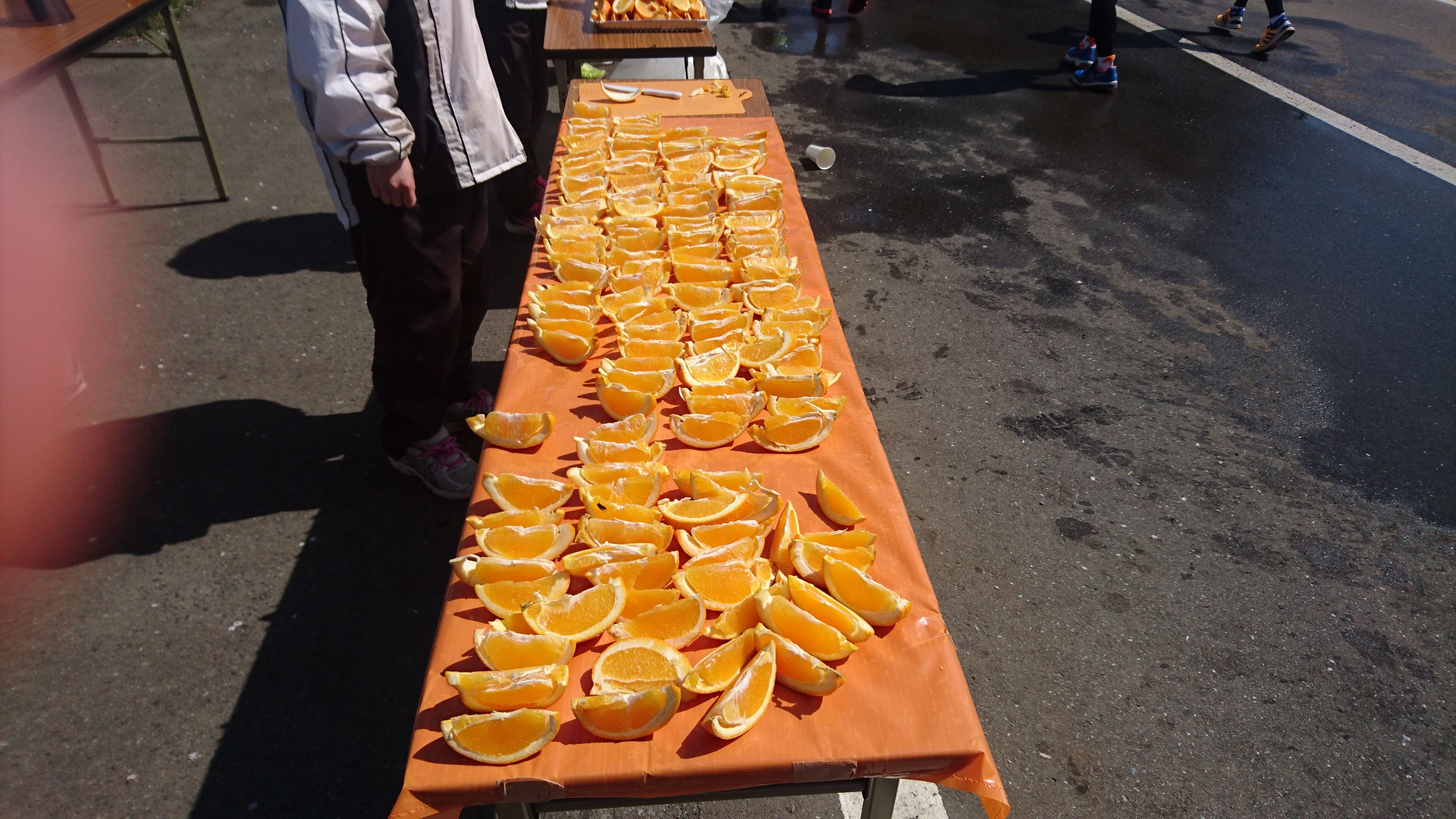 レースは 2 時間 4 分で平凡なタイムでした。レースが終わったらおもてなしコーナーがあるので並びます(今日は時間があった)。