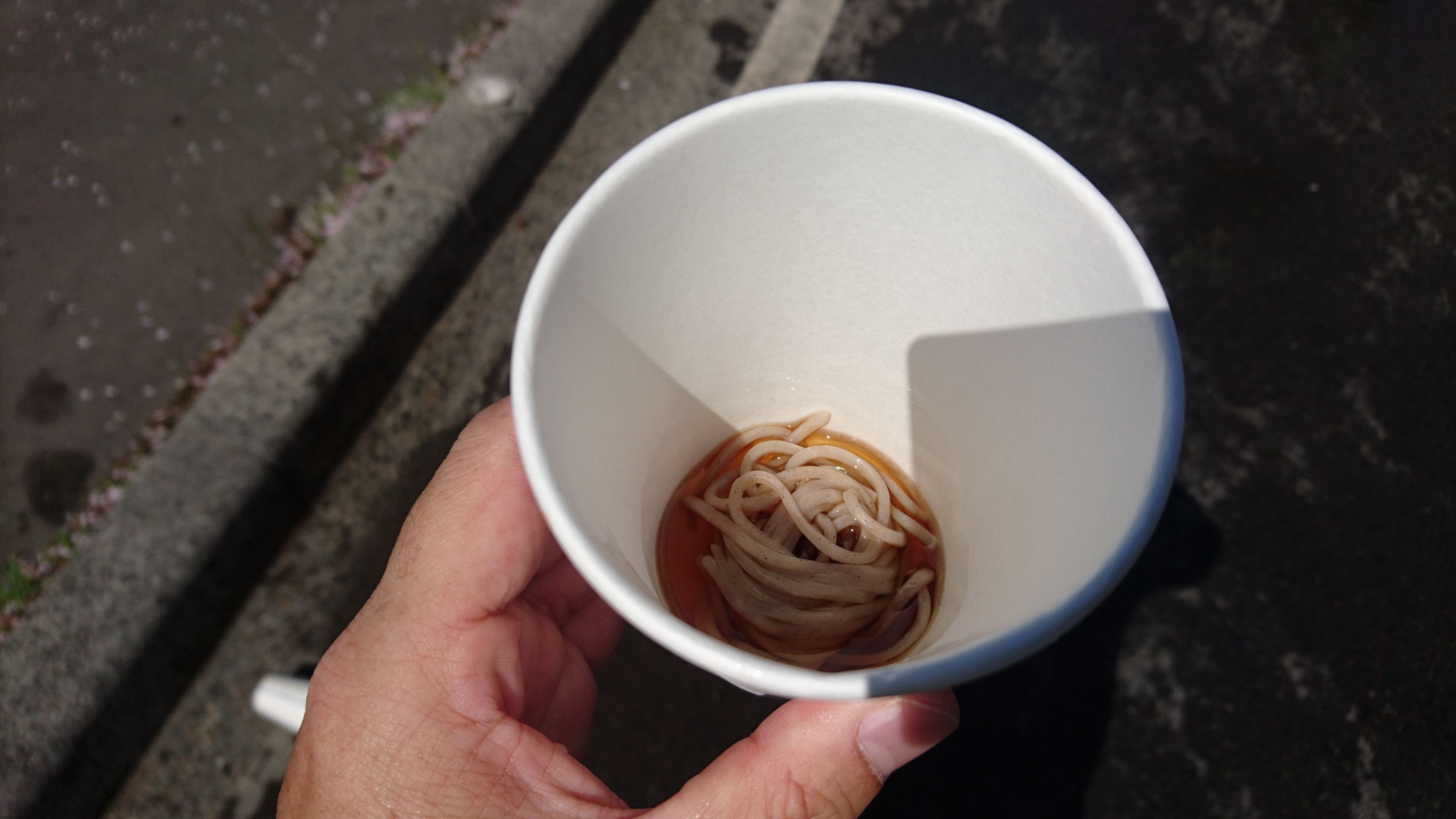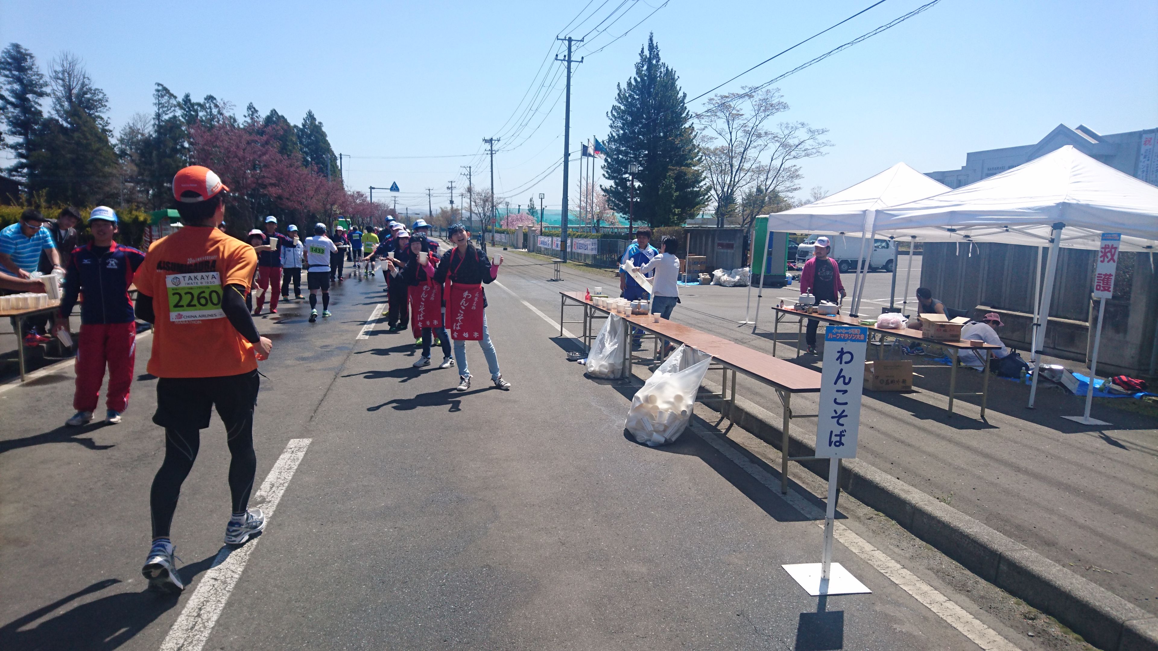 スタートをすると 3km を超えたあたりで給水所が。「水でーす」「スポーツドリンクでーす」「わんこそばでーす」、え?わんこそば?