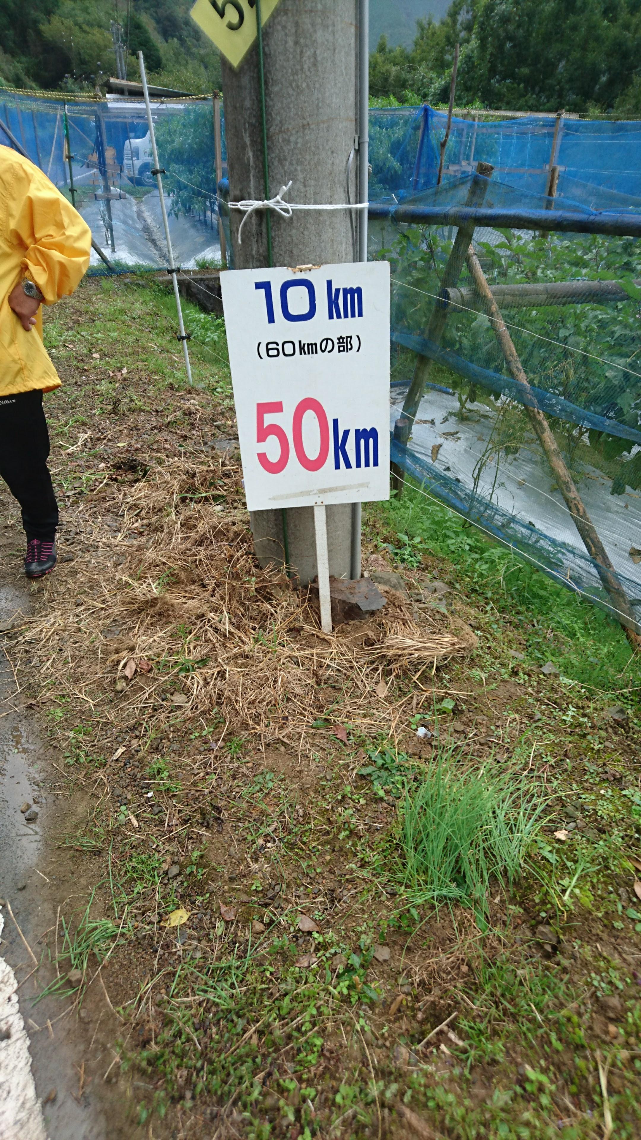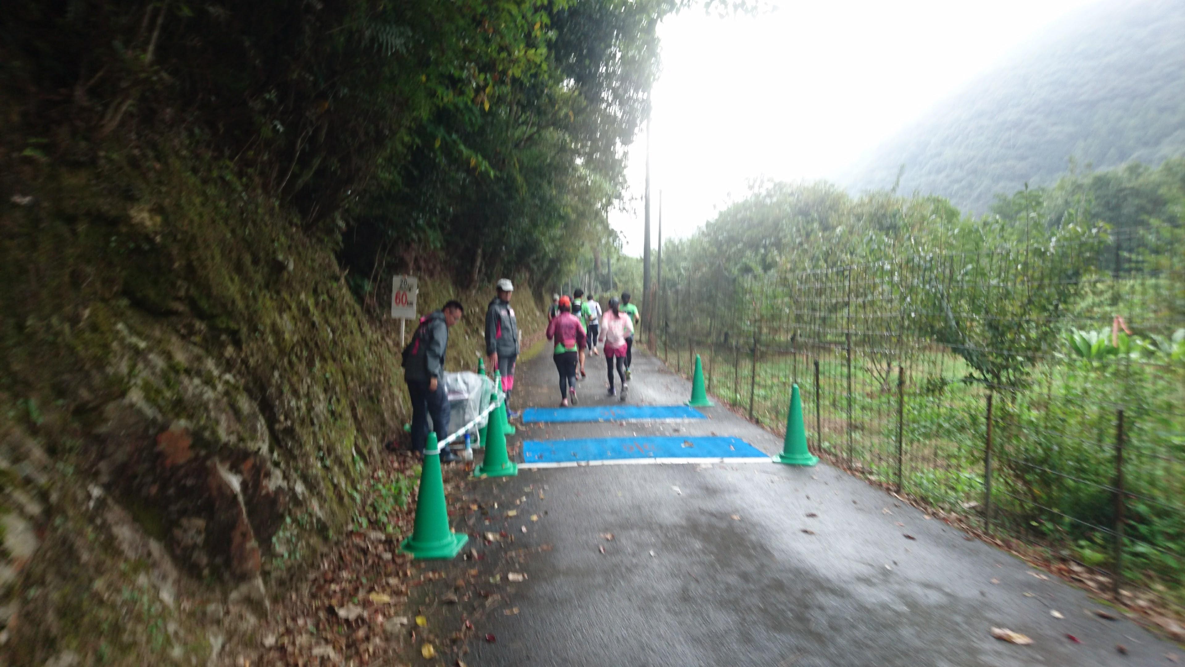 やっと 60km の看板を見ます。残りはフルマラソンよりも短い!と思った瞬間、なんだこの狂った感覚は!と思いながらも、できることはただ一つ。右足と左足を交互に出して前に進むしかないのです。なお、このころ改めて雨がパラパラと降っていました。