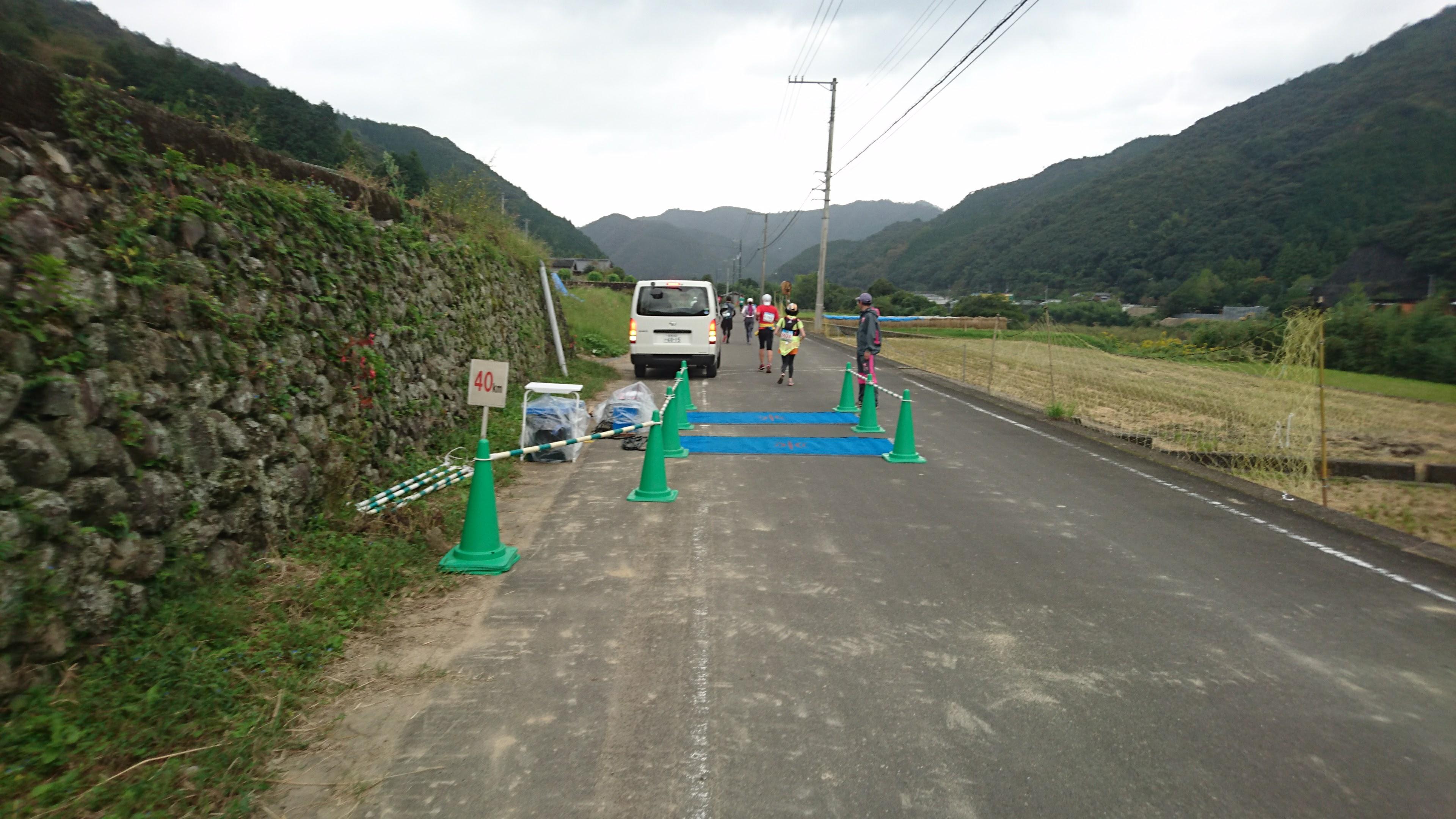 40km の手前で一度パラパラと雨が降ったものの、すぐに止んだのでこの段階では「ちょっと水にぬれて体が冷えたので走りやすくなった」でした。このあと、衝撃の看板を見ることを気にせず、40km を通過します。