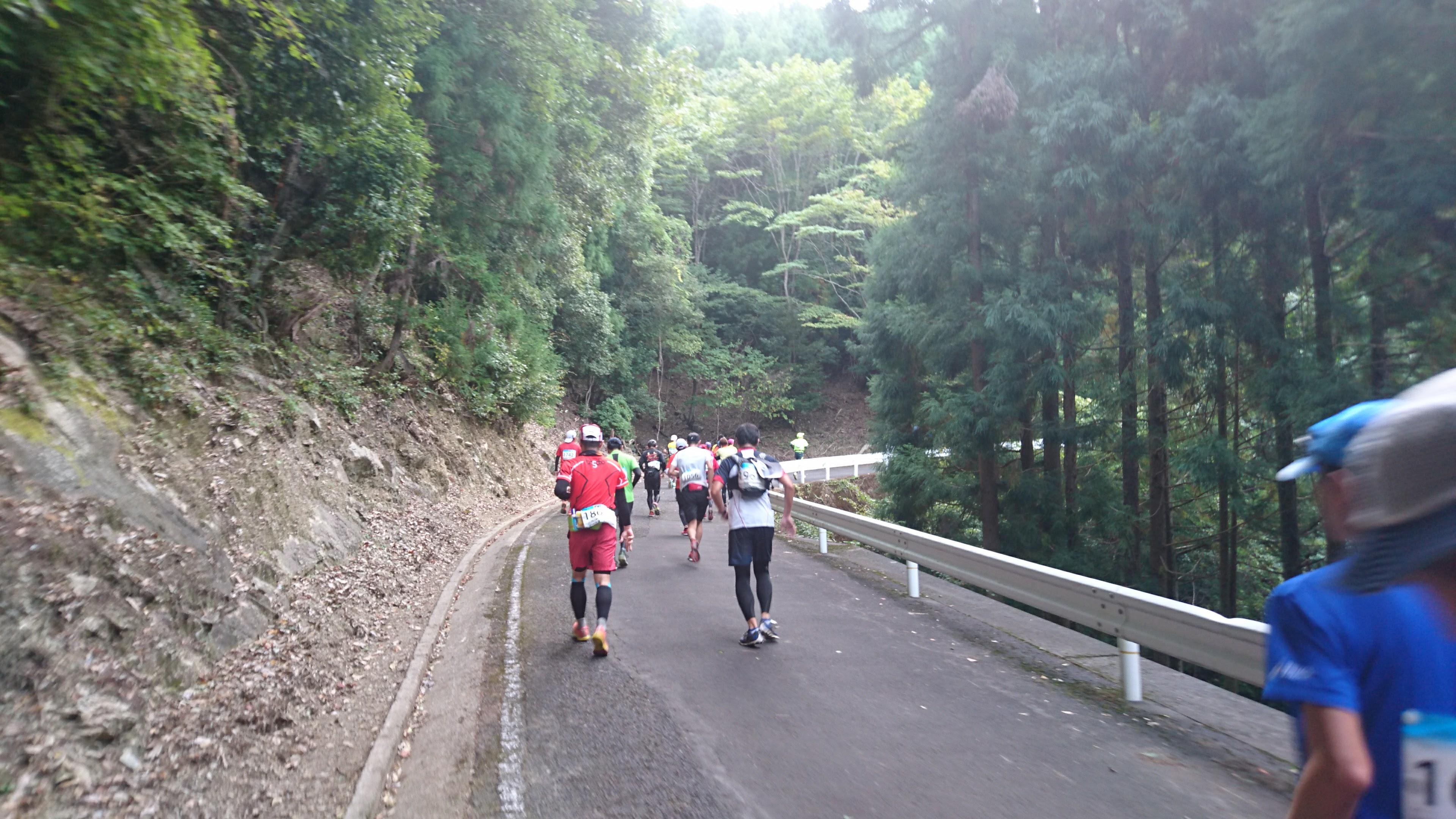 サポートランナーの方に話しかけてみることにします。実はこの後、ペースを落として走るそうです(そら、ずっと同じペースは難しいよな、、、50km を超えたところで)。そして、そのペースを教えていただき、それよりも前を走ればいい、のが私の中での結論。とはいえ、話をしていた時は登り坂で、「この登りは歩きます~」と言っていたので、便乗しながらペースのアドバイスをいただきました。登り切ったところで「ありがとうございます、頑張ります」と言い残して、頂いたペースよりも少し早めに、走っていきます。