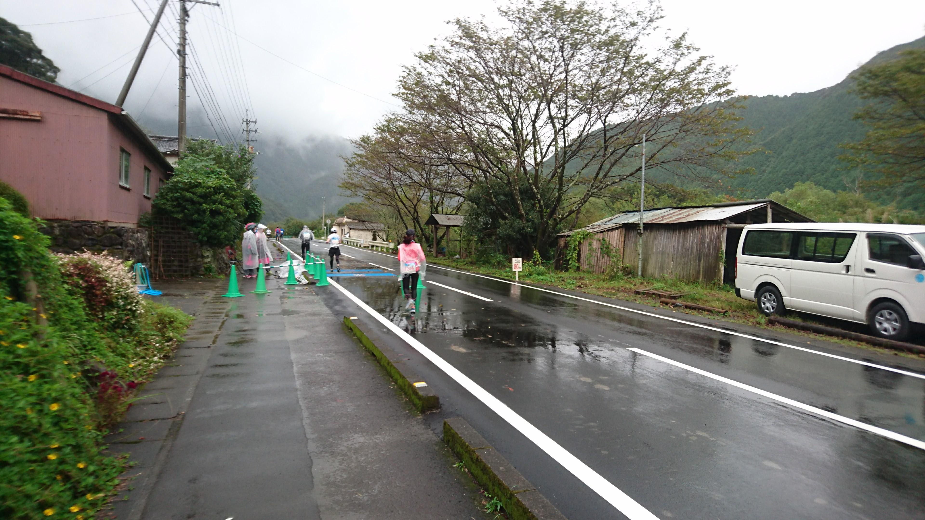 そして確実に降る雨の中、80km を超えます。残りハーフマラソンよりも短いよーと応援の人は言ってますが、単位がおかしいです!
