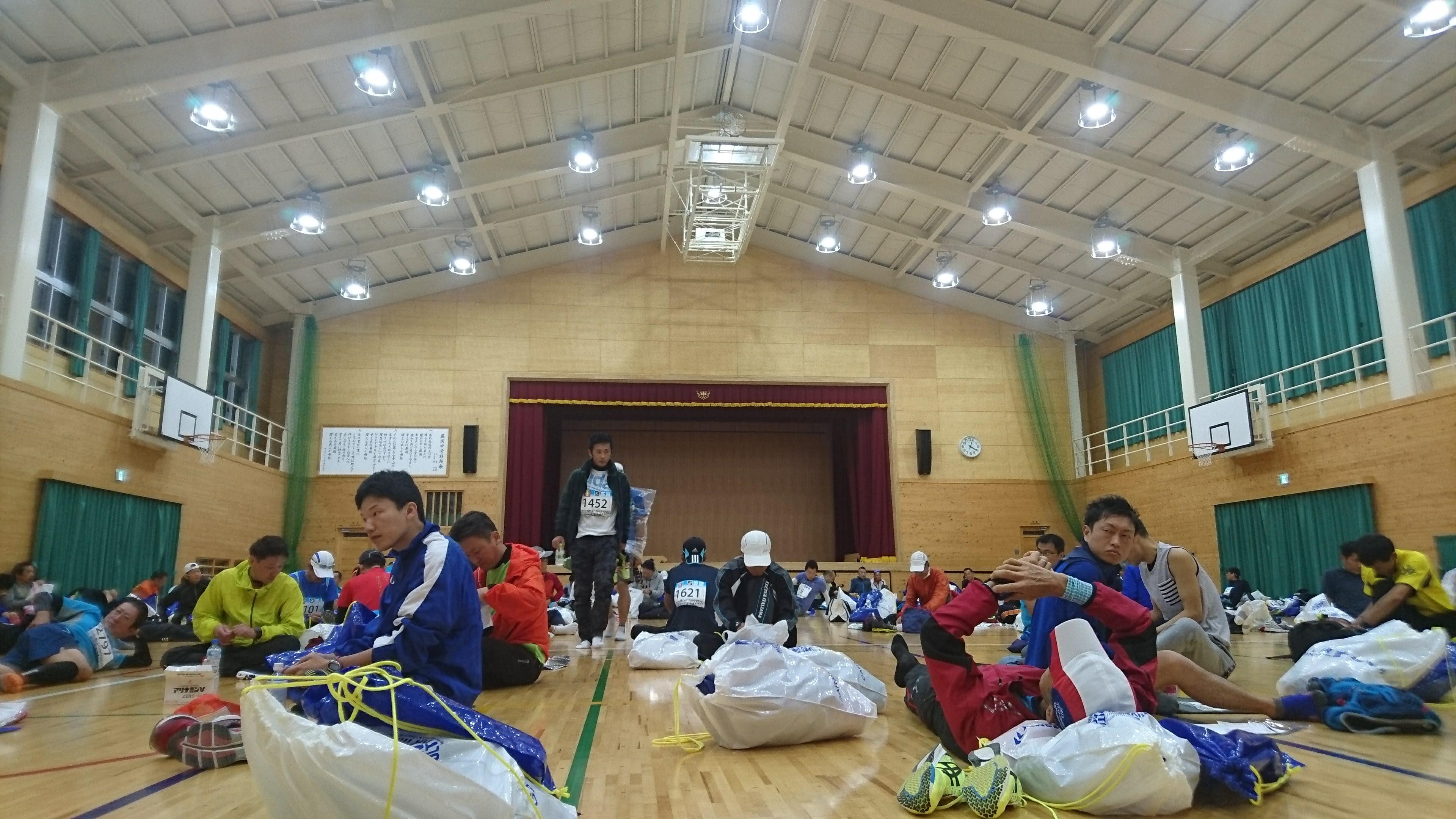 レース 30 分ぐらい前、トイレに行ったり水分の補給をしたり、ということで体育館から外に出ます。体育館の中もすごかったのですが、運動場も人がどんどん来て、盛り上がってまいりました。
