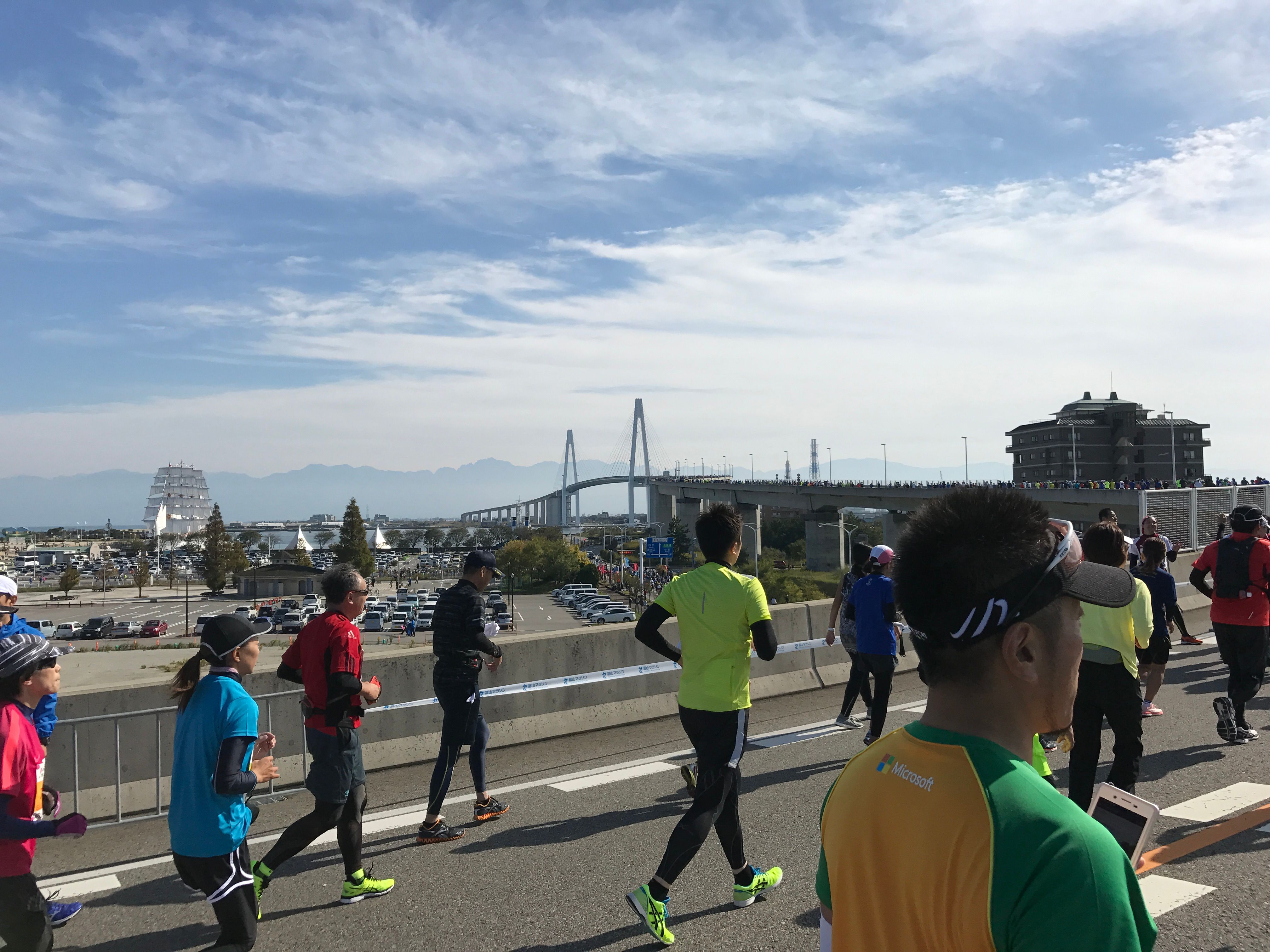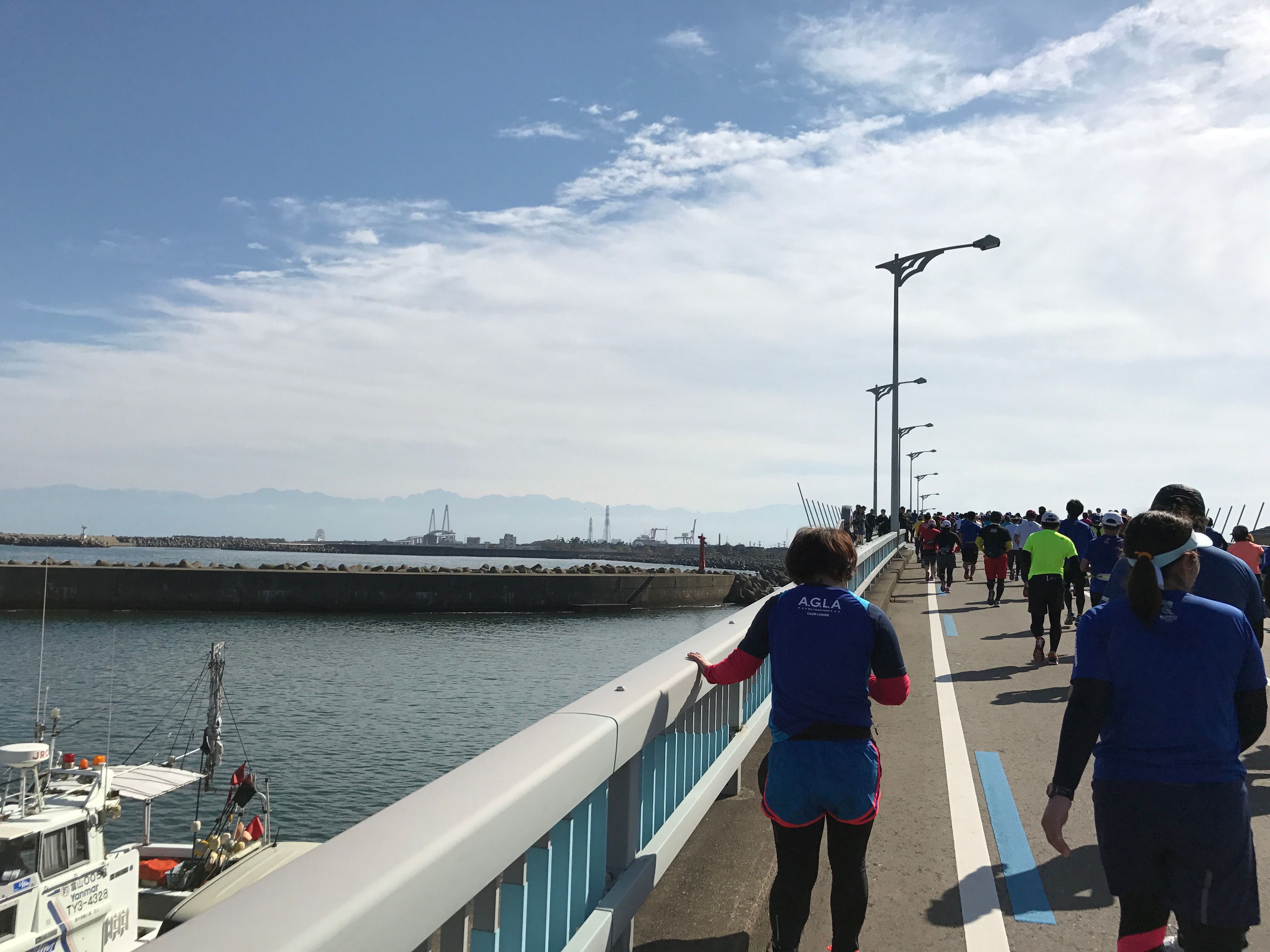 ここが富山マラソンの最大の山場でもあり、景色が綺麗です。おまけに帆船も止まっていて、景色をここではのんびり楽しみます。
