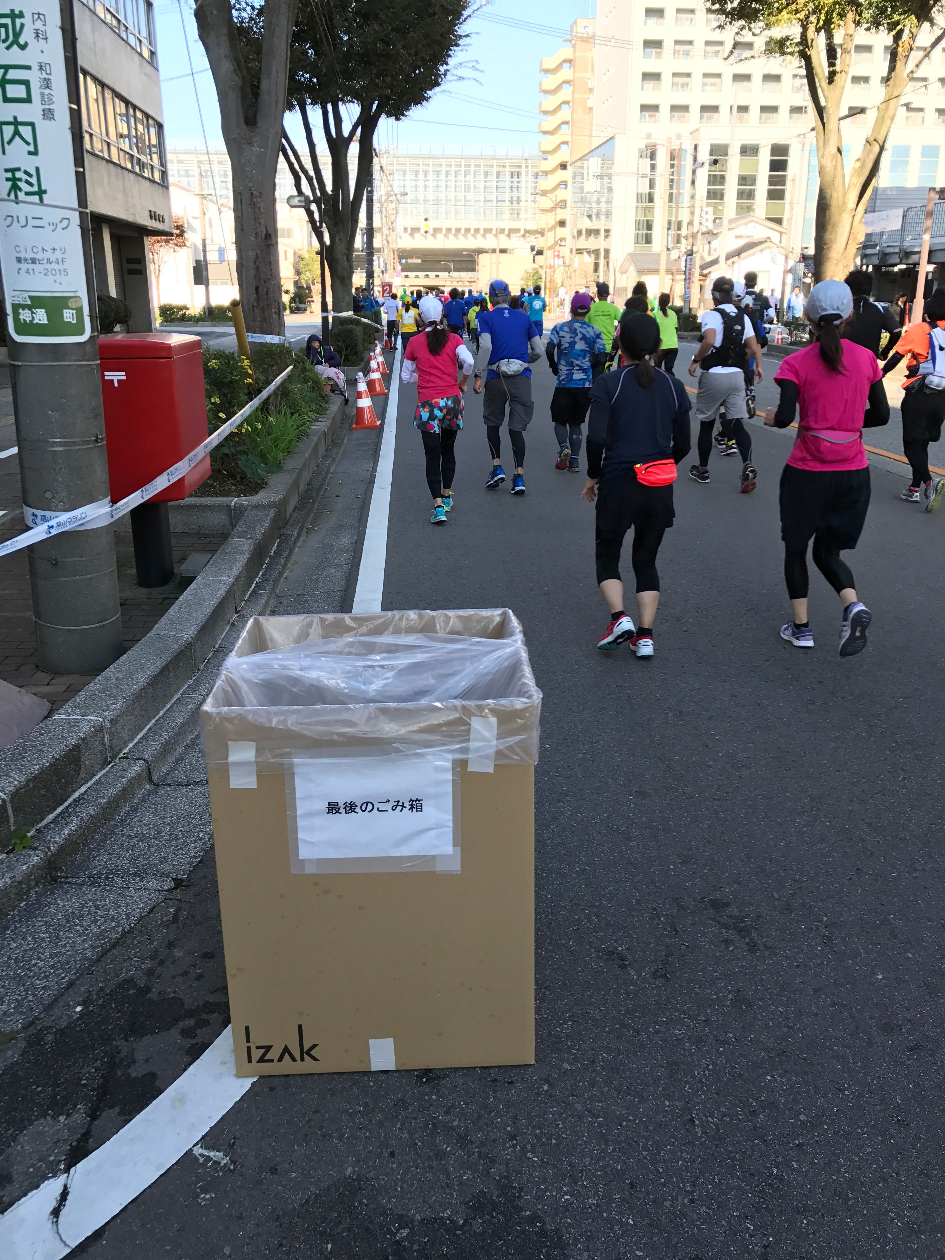 最後のゴミ箱を超えて、ゴールします。ちなみに最後のゴミ箱というのは、エイドから少しゴミ箱が並んでいるわけですが、それの最後を宣言しています。これでゴミを捨てる場所の限界地点がわかるので、間違えて紙コップ持ったまま走らなくていいのでこの仕組みは非常にいいですね。