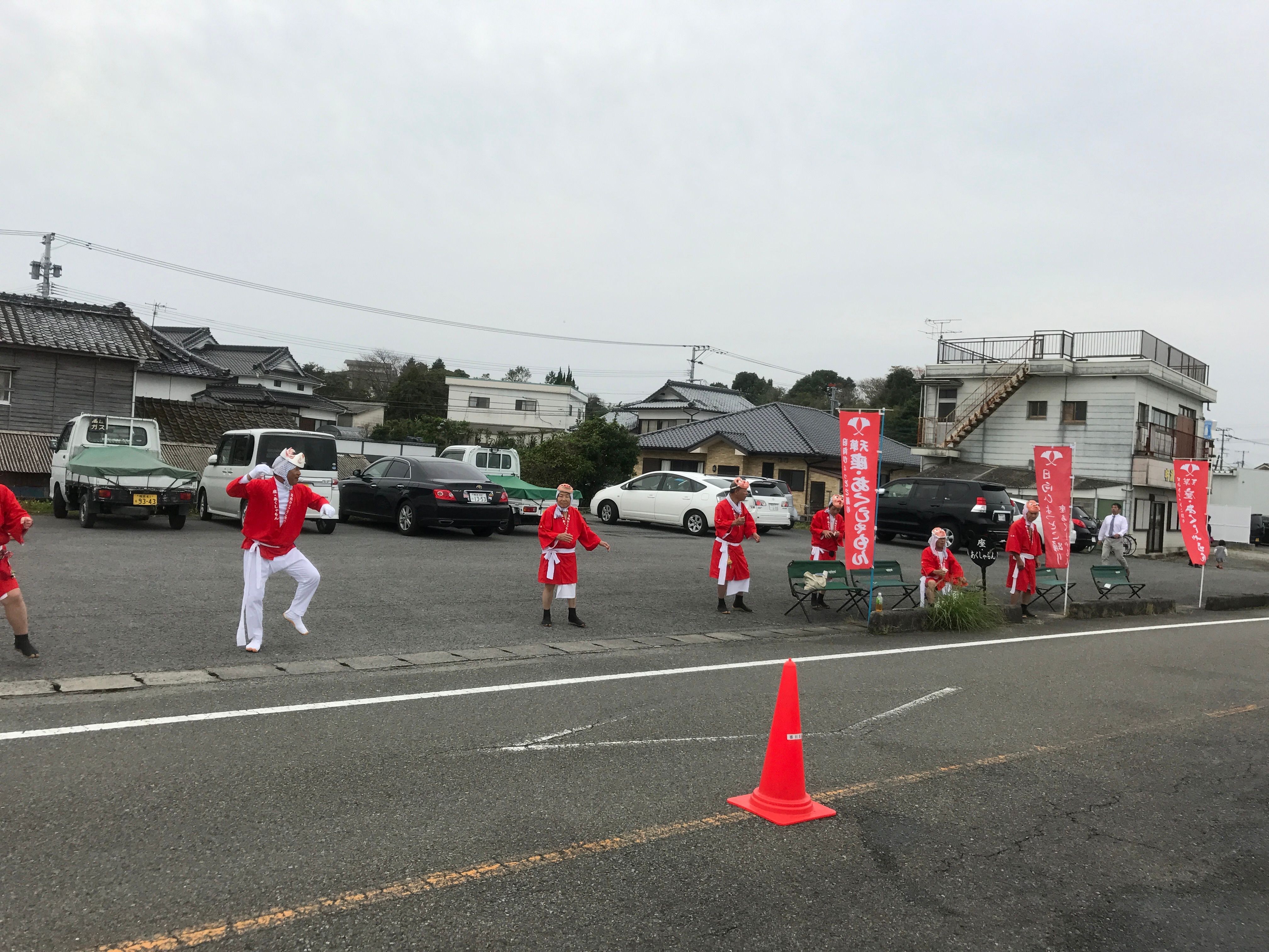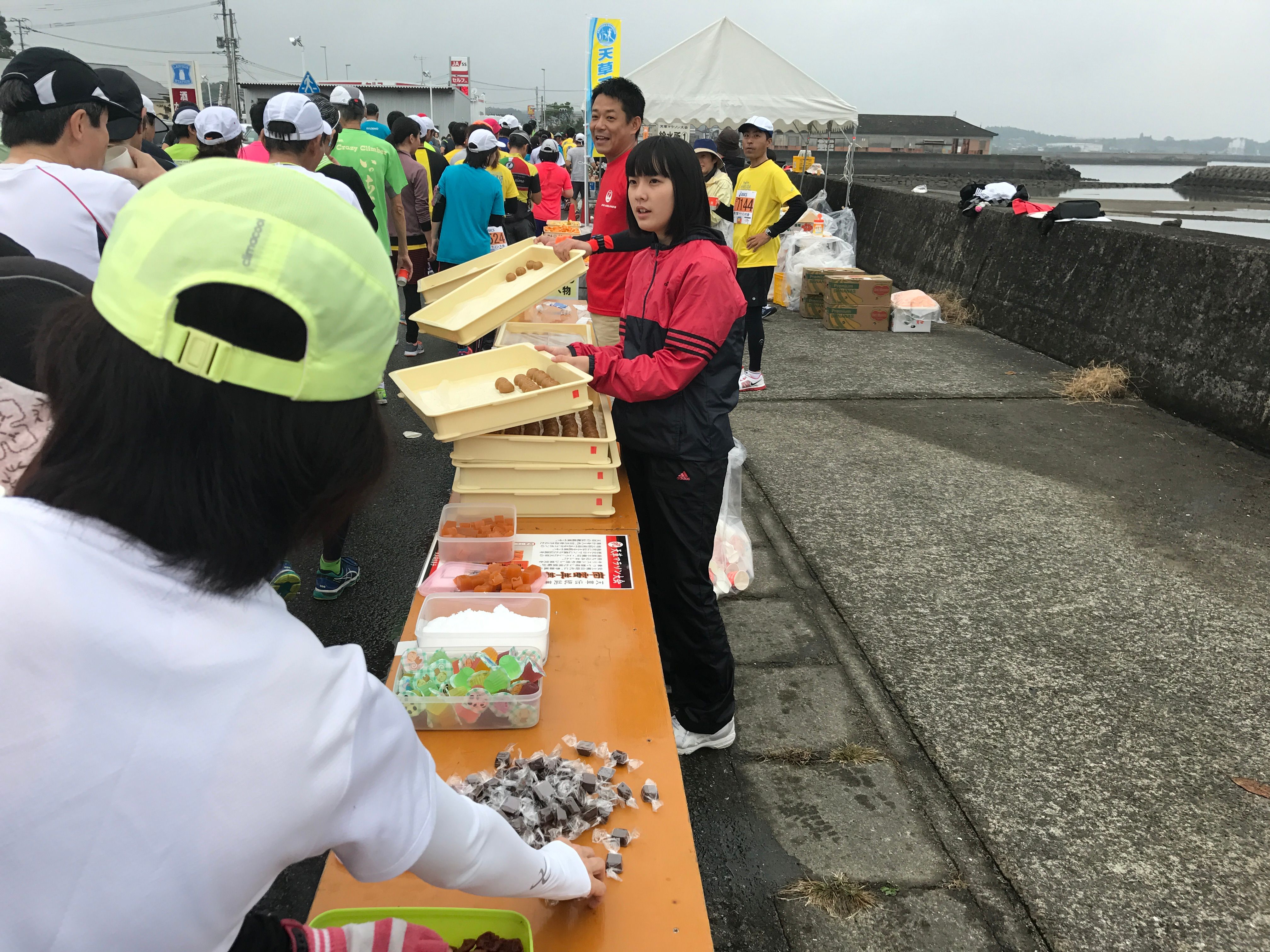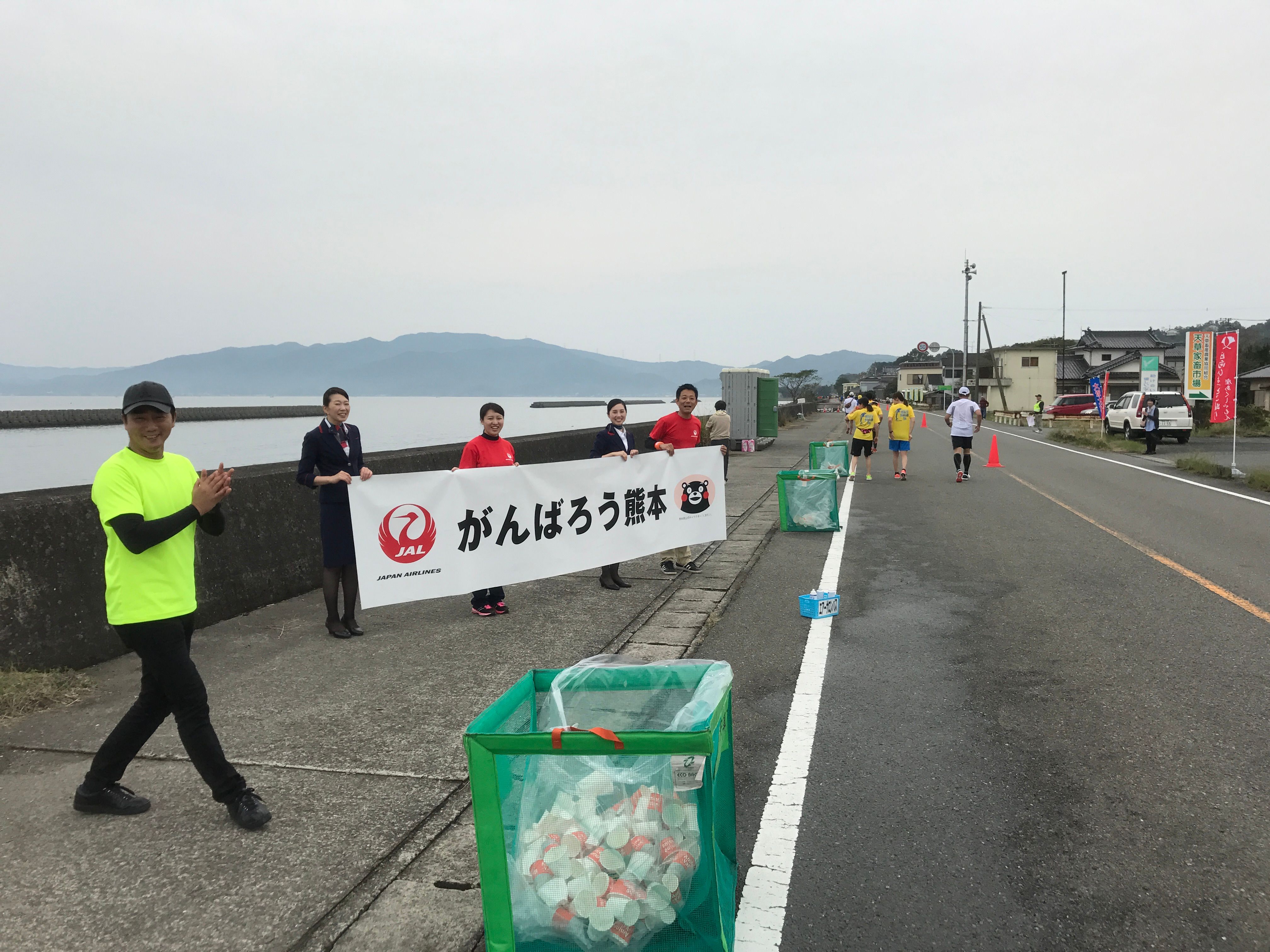 天草の応援ですが、なぜかひょっとこが多いです(笑)。給食は普通でしたね。海岸沿いを走るところも多く、当日は暑かったので水をかぶりながら走りつつでした。沿道では、がんばろう熊本の垂れ幕も見ました。