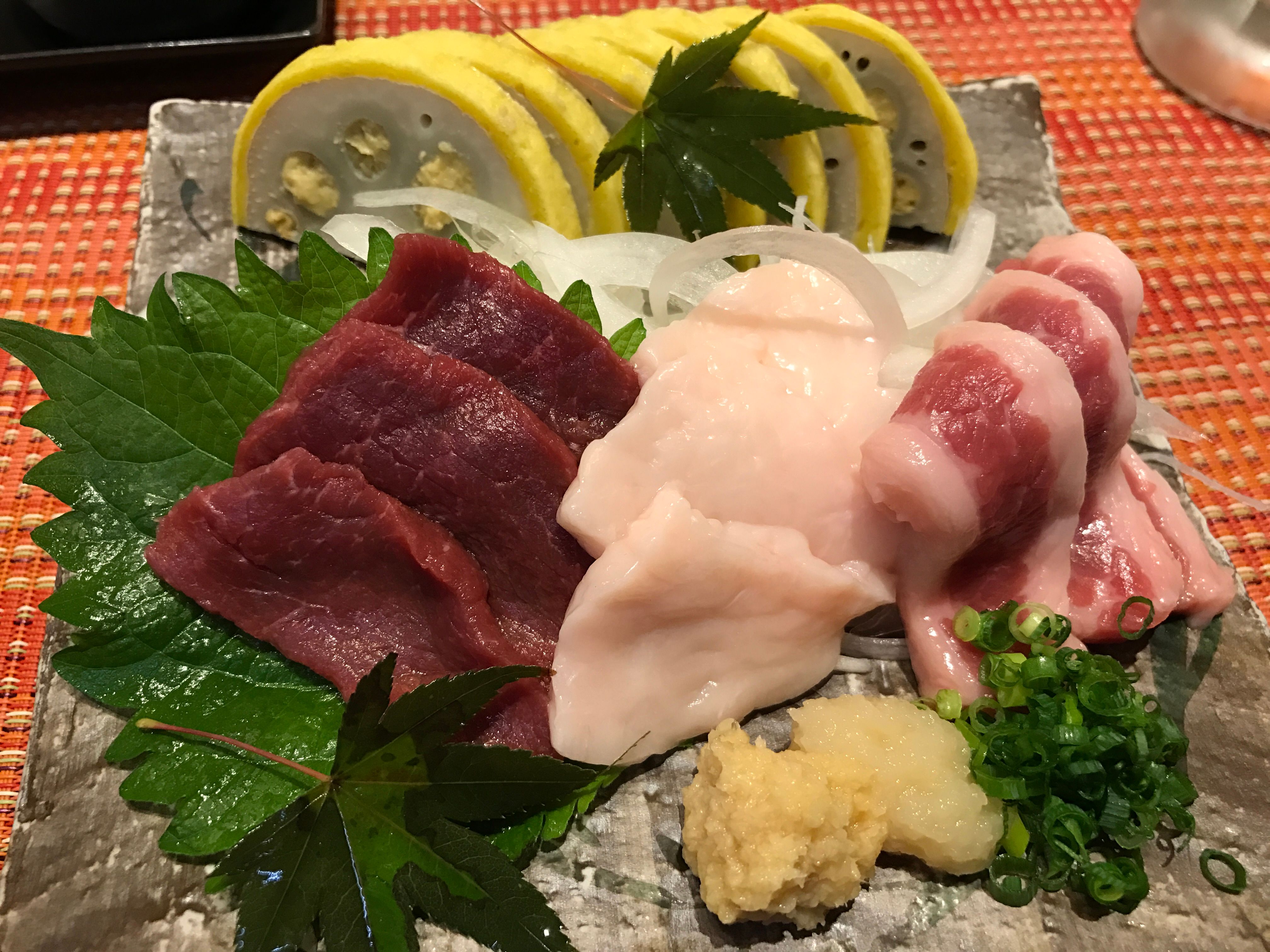 熊本宿泊なので、もちろん熊本名物を食べます。馬刺しなどを中心に、美味しくいただきました。