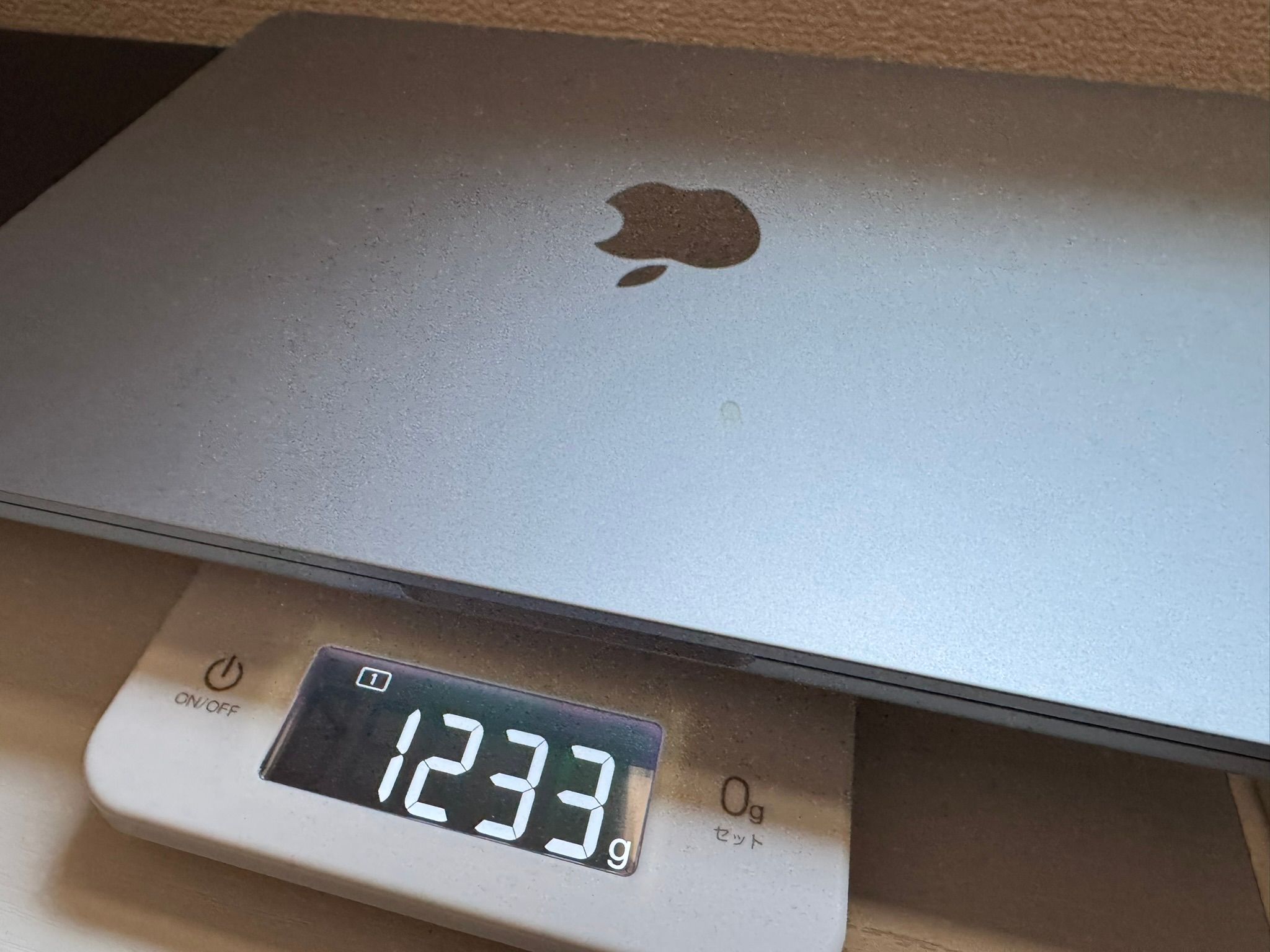 以前利用していたのが MacBook Pro 14 インチ - M3 だったこともあり、1.61kg でスペックの割には軽い、と思ってはいましたが毎日持ち歩くとやっぱり重く感じます。測らなくてもスペックに記載されているのですが、きちんと計量すると以下のような結果となりました。