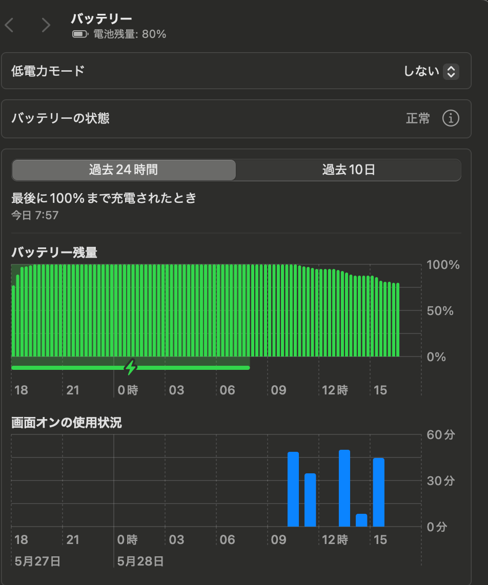 作業的には手元でこのブログの微調整をしたり、メールをチェックして返したり、という感じで日常使いをしていた感じです。ビデオの編集とかをすればまた変わるかもしれませんが、家を出たときに 100% のバッテリーが帰宅したときでも 80% 残っています。